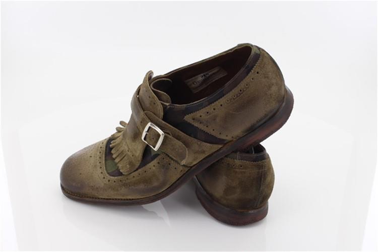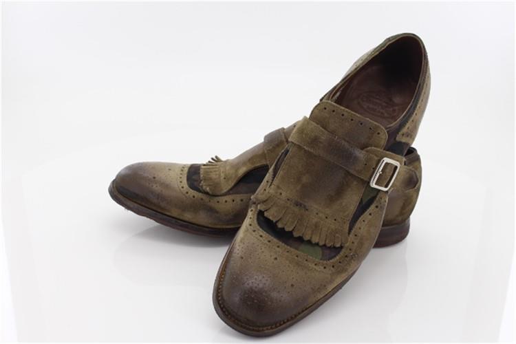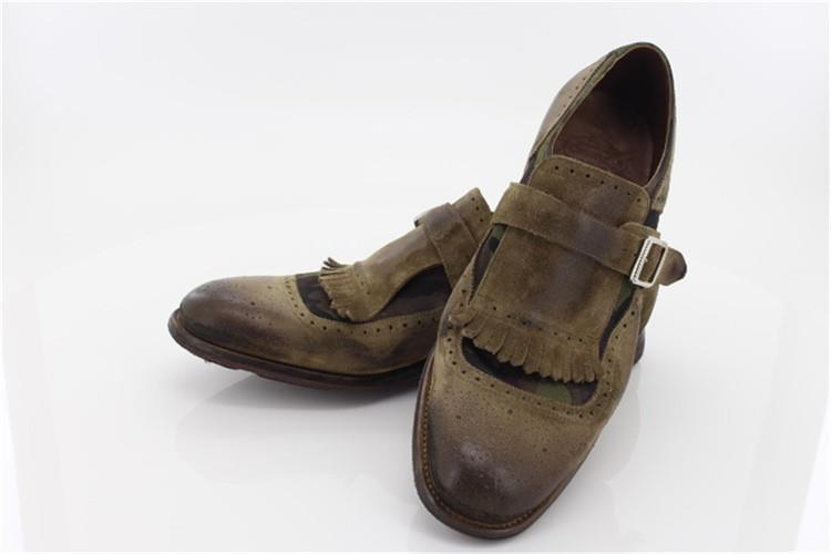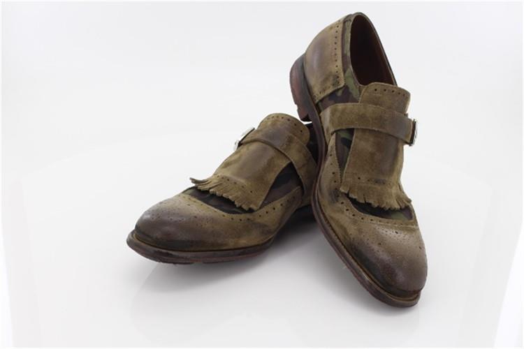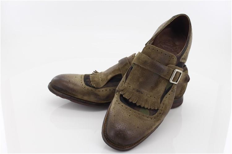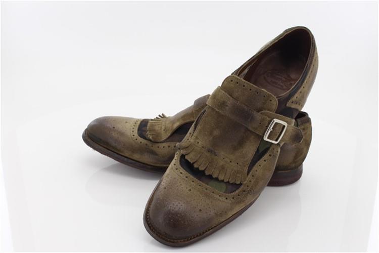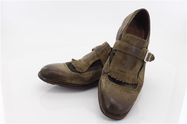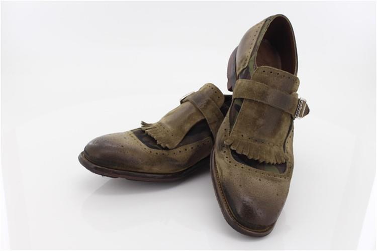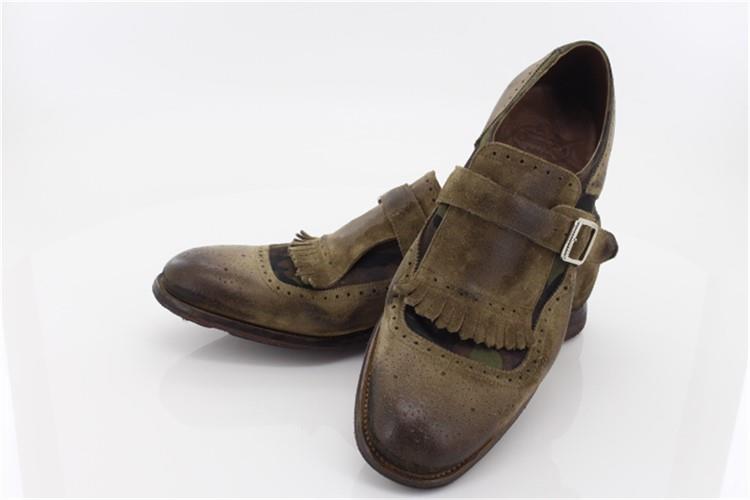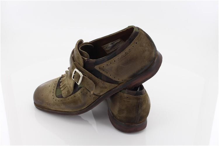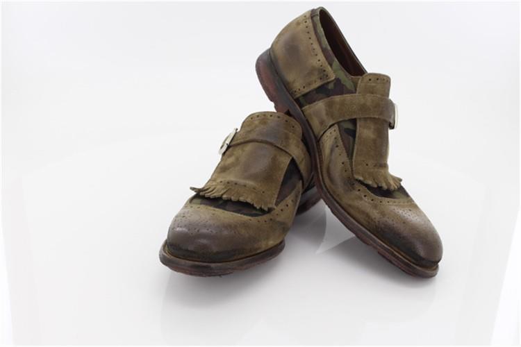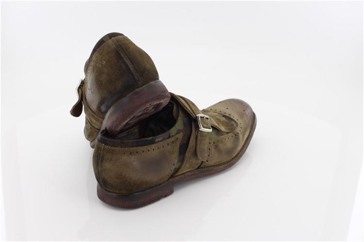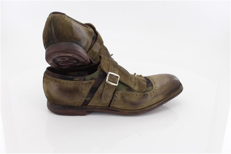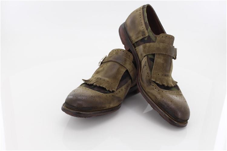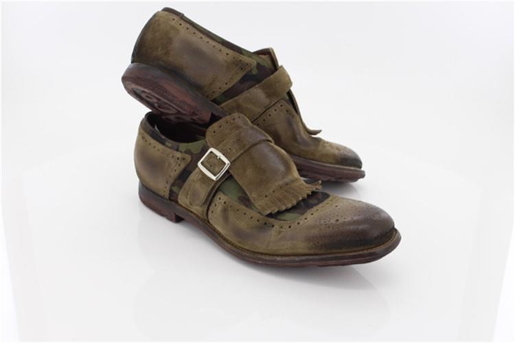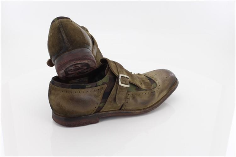 Il carattere distintivo di queste scarpe è immediatamente evidente nella tomaia camouflage bicolore. Questo motivo sottile ma sorprendente offre una texture visiva sofisticata, superando i toni uniti convenzionali pur mantenendo un’aria di lusso discreto. Ogni dettaglio, dai materiali scelti con cura alla cucitura precisa, testimonia un impegno per la qualità sinonimo dell’eredità Church’s Shanghai. La chiusura a fibbia singola (monk strap) non solo assicura il piede con elegante semplicità ma aggiunge anche un tocco classico che si abbina al moderno motivo camouflage.