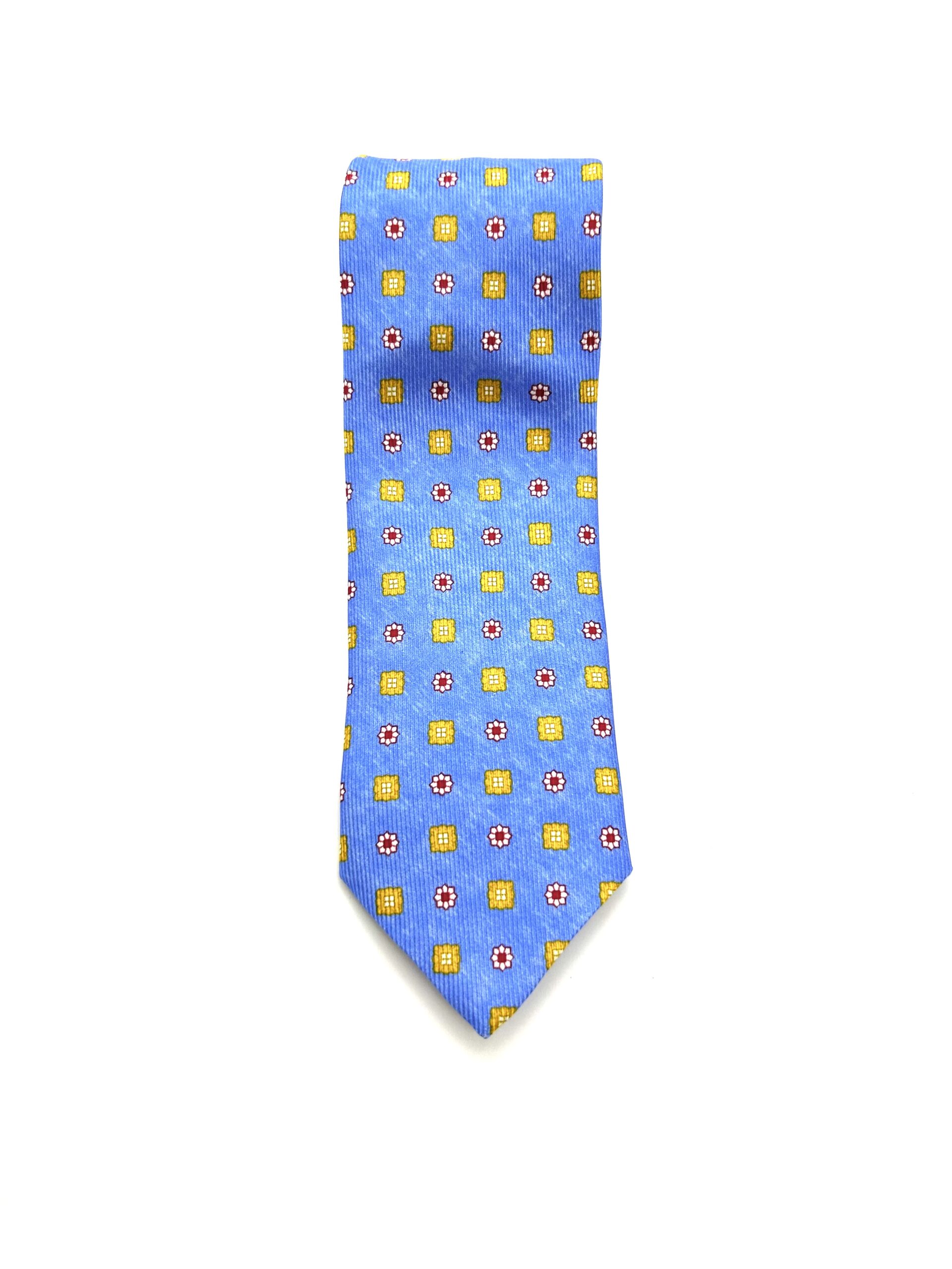Ogni cravatta in seta blu è tessuta con seta premium, garantendo una finitura lucida e un drappeggio morbido e confortevole. Il complesso motivo fantasia, caratterizzato da piccoli motivi geometrici in tonalità calde, fornisce un contrasto di buon gusto contro lo sfondo blu sereno, prevenendo la monotonia senza essere eccessivamente audace. Questa scelta di design riflette un impegno per una raffinata discrezione, permettendo alla cravatta di completare piuttosto che sovrastare il tuo abbigliamento scelto. È un pezzo essenziale per coloro che apprezzano accessori che testimoniano qualità e design duraturo.