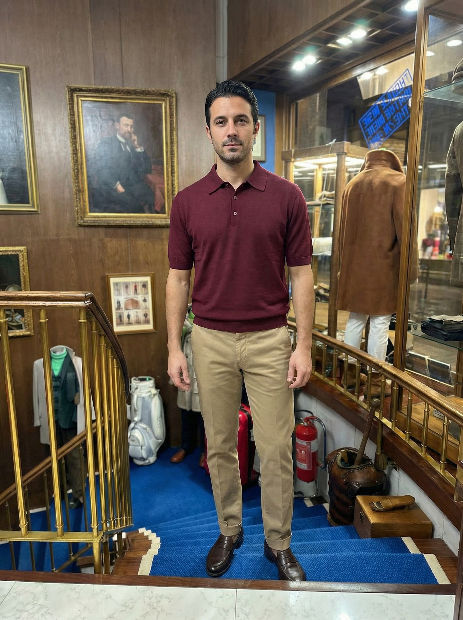 La profondità del bordeaux incontra la nobiltà del cotone Sea Island in questa polo Serafino esclusiva. Questo tessuto, raccolto a mano nelle Indie Occidentali, è celebre per la sua finezza estrema, che regala al capo una caduta perfetta e una mano incredibilmente vellutata.