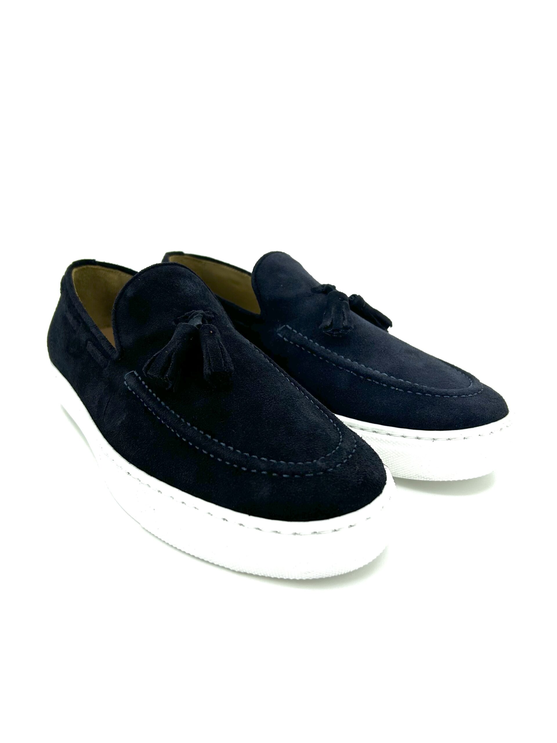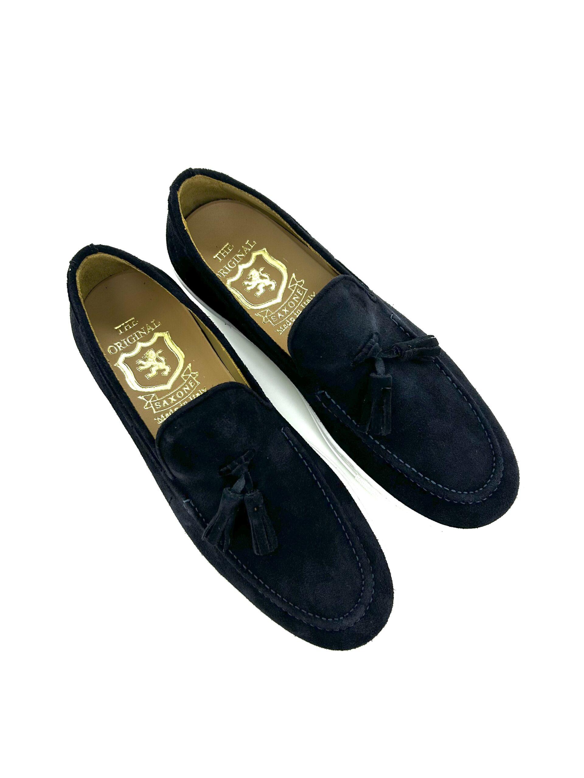 Saxone mocassino con nappina, in pelle scamosciata blu, suola gomma
