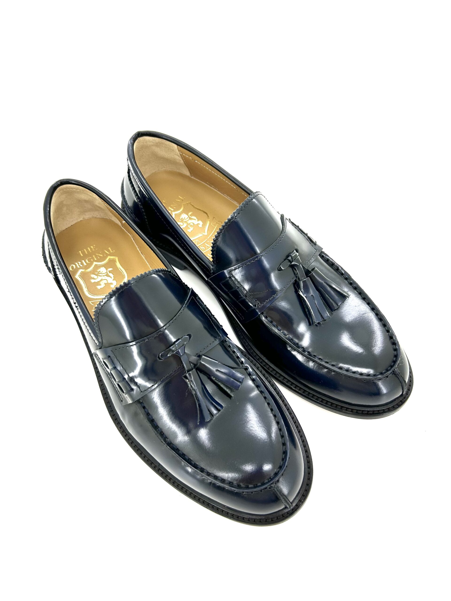 Saxone mocassino con nappine uomo, in pelle Polish binder blu scuro, doppia suola cuoio