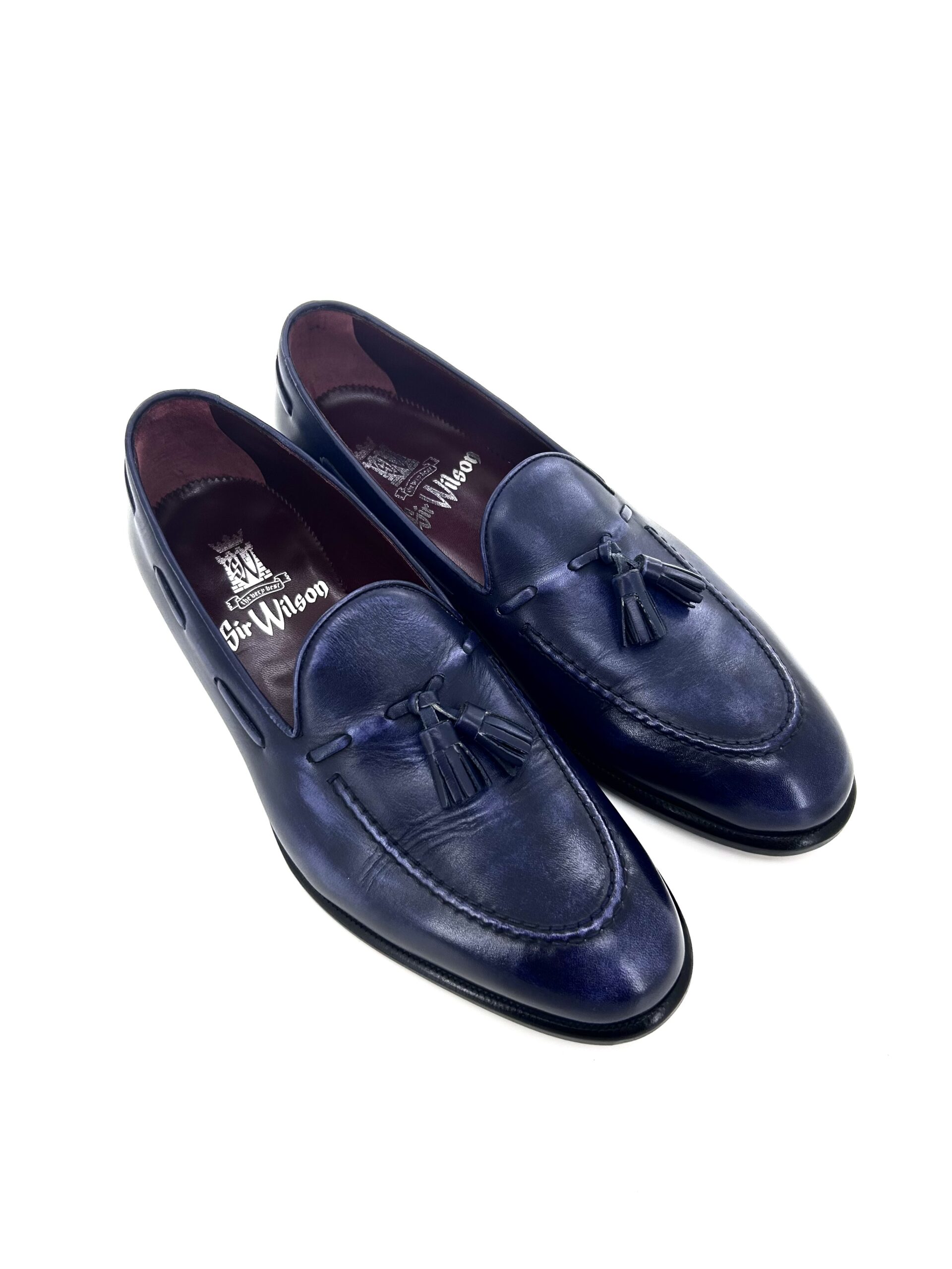 Entra in uno stile distinto con i mocassini con nappine uomo Sir Wilson. Questi sofisticati mocassini sono meticolosamente realizzati in pregiata pelle blu navy brunita, offrendo un colore ricco e sfumato che si intensifica con l’uso. La classica costruzione a mocassino, arricchita da raffinate nappe, presenta un’estetica duratura che trascende le tendenze effimere.
